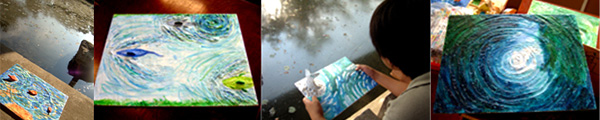 学校に戻り、この不思議な水面をかつての画家たちはどう表現したかを鑑賞することになった。 モネ、シスレー、福田平八郎、山口蓬春…。 水辺を描いた名画の水面部分だけを鑑賞し、水面だけで周りの風景や季節、時間、温度などが読み取れることに気づいた。 その気づきを表現に活かそうとベニヤ板に液体粘土とアクリル絵の具を使って自分の水面を表現した。 液体粘土を使って半立体にしたのは目だけでなく、手でさわって水面を感じてほしかったからである。 子どもたちは実際目にすることのできないベニヤ板の周りの風景を想像しながらこだわって表現していた。 この授業のあとは一時的ではあったが水溜りに映る景色や空の色、夕日の美しさなど身のまわりの自然に、敏感に反応する子どもが増えたのは興味深かった。
