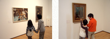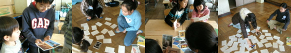 3学期。こすもぴあの美術館発表に興味を持ってくれていた1年生が近代美術館に連れて行ってほしいとやってきた。 子どもたちは嬉しい反面、1年生が美術作品に興味を示してくれるかどうか不安も感じていたので、美術館に出かける前に1年生と5年生のペアで近代美術館作成の「Museum Box宝箱」(所蔵作品のアートカード)を使って遊んだ。 2枚のカードの共通点をみつけるトランプ型ゲームやカルタ型ゲーム、カードをどんどん並べて物語をつくるなど5年生のリードのもと1年生は遊びをとおして作品に親しんでいた。