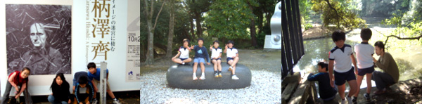 本校は美術館が隣接しているため、美術館に興味のある子、休み時間に特に予定がない子、散歩がしたい子などを連れて気軽に休み時間も出かけた。 何をするわけでもなく、ただただ美術館や美術館の周りの自然や空気にふれる。 ある子は天井に映る水面の影に目を奪われ、ある子はぼんやりと池を眺める。 騒然とした学校から離れ、深呼吸をしているようにも見えた。 そのうち子どもから他愛もない話がポツポツと始まる。