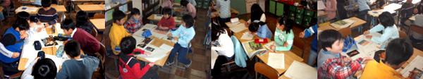 まずは感じたことやみつけたことを、どんなことでもいいので正直にかきだした。 そして感じた事をもとにいろいろな想像をふくらませた。 作品に描かれている人物に名前をつけることや、色から季節を考えることから始まり、 ぶきみな部分や不思議な部分から実際にはおこりえないような物語を考えたり、 作品の中に描かれている人物から会話を想像してみたり、複数の絵を結びつけて一つの物語をつくったりした。 積わらが描かれた風景画からは、鳥の鳴き声や、わらの中で寝ている人の寝息の音、時間帯、その村での暮らしぶりなどと、実際には描かれていないことまでも感じとっている子もいた。 物語という形式を与えることで、絵と子ども達の距離がどんどん近づいていく様子がみられた。