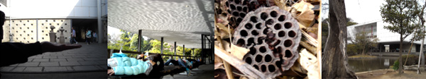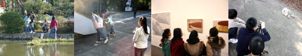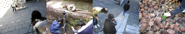 子どもたちはデジタルカメラをもつことで何か面白い形をみつけようという意識が高まり、どの子も夢中でシャッターを切っていた。 「こんなところに△がある」「この形も面白くない?」「水の波紋が映る天井は映画で使えるね」「あっちに蜂の巣みたいなものがたくさん落ちていたよ」 「水面に映る美術館だけを撮影したら面白かったよ」「この場所を撮影で使おう」・・・。 美術館や周辺の自然の中から様々な形や不思議なもの、心地いい場所をみつけ映画の発想を膨らませていた。